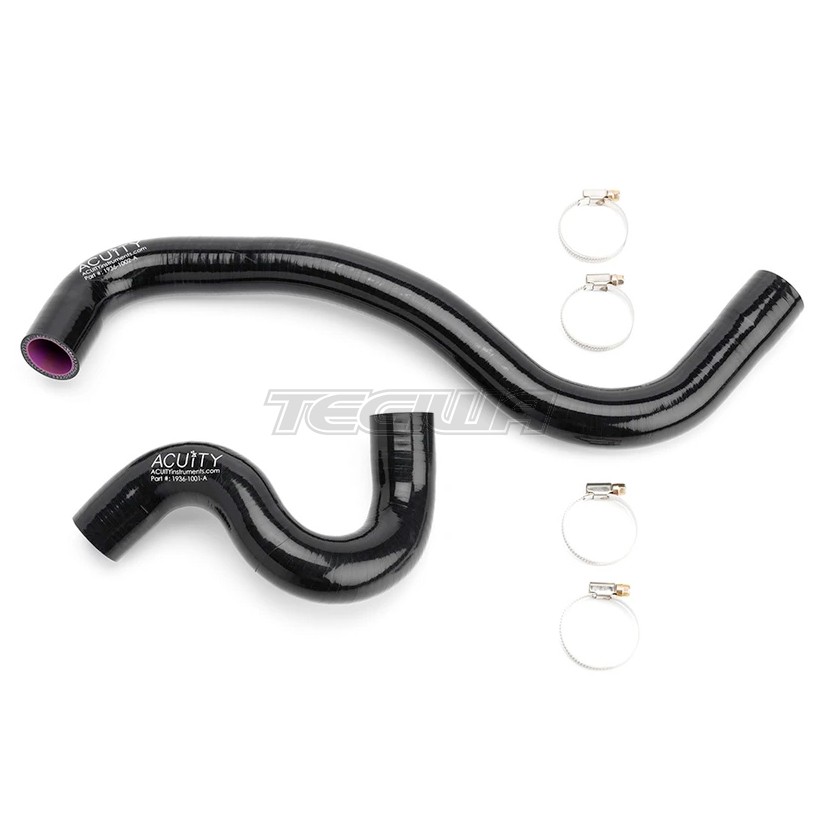 While investigating the overheating issue that affects FK8's in hot conditions, ACUiTY engineers determined that the radiator can reject more heat if the water flow through it is reversed. This is due to how the intercooler rejects heat from charge air and how that heat flows through the lower part of the radiator. In very hot conditions on cars that also have upgrades like hood venting and an upgraded radiator, water temps were reduced by as much as an additional 4.5°F (2.5°C) after installing these hoses. On totally stock cars, temperature reduction is lower, close to 1°F (0.6°C) in hot conditions. In addition to this extra cooling power, the polyester-reinforced silicone construction helps the hoses to handle up to 100F hotter temperatures than the stock EPDM rubber hoses. As an added benefit, the kit includes German-style hose clamps that have formed threads and rolled edges to help protect your radiator hoses from the cutting damage that traditional hose clamps often cause on silicone hoses. Each set comes with 2 silicone radiator hoses and 4 German-style hose clamps.