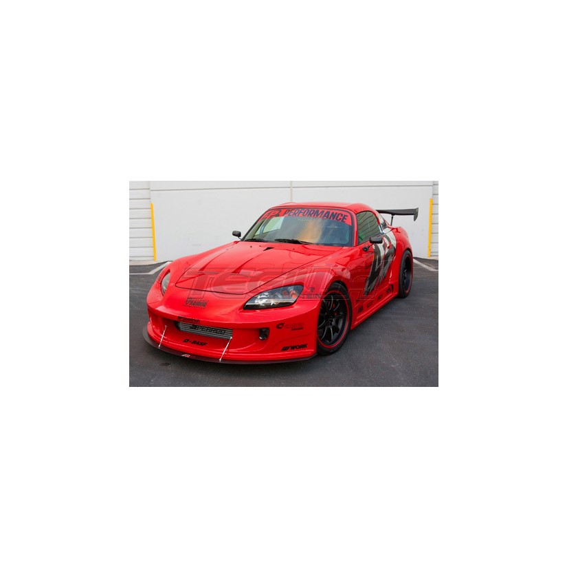 The S2-GT Widebody Aerodynamic Kit for the Honda S2000 brings the performance of a grand touring racecar to the street. To improve overall handling and traction, this aerodynamic kit increases +45mm per front fender and +50mm per rear fender allowing for massive front wheel sizes of 18”x9” with 265/35/18 profile tires and rear wheel sizes of 18”x10” with 285/30/18 profile tires. To enhance stability, the S2-GT Widebody Aerodynamic Kit includes a carbon fiber front wind splitter that is designed as a front undertray. The optional 67” (1,700mm) GTC-300 S2000 Spec adjustable rear wing adds downforce on the rear wheels to increase rear-end stability.