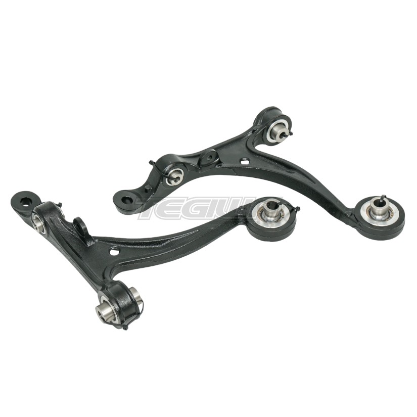 This is a pair of front lower control arms outfitted with spherical bushing in replacement of the OEM rubber bushings. Benefits are increased handling. Super sharp turning characteristics. And precision alignment. Excellent replacement for anyone with bent lower control arms looking to change their arms with new control arms. Spherical bushing eliminate deflection of the rubber OEM bushings. These are extremely smooth to drive on public roads.