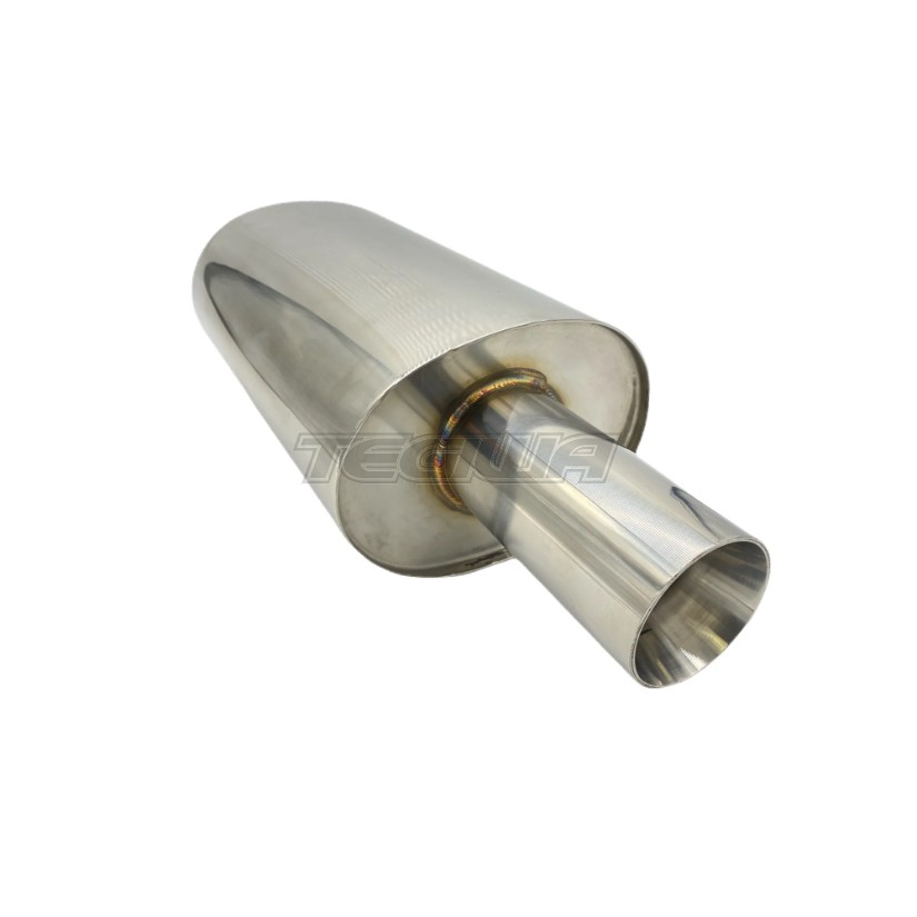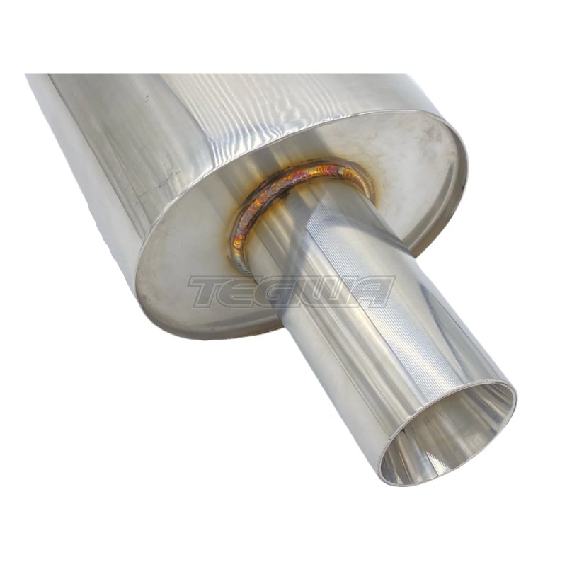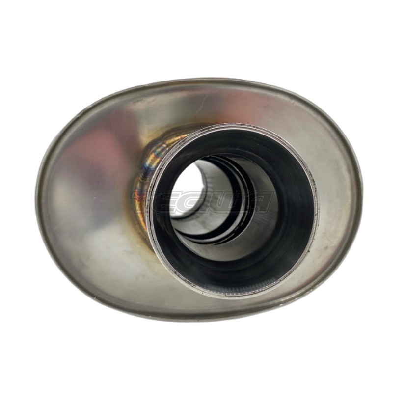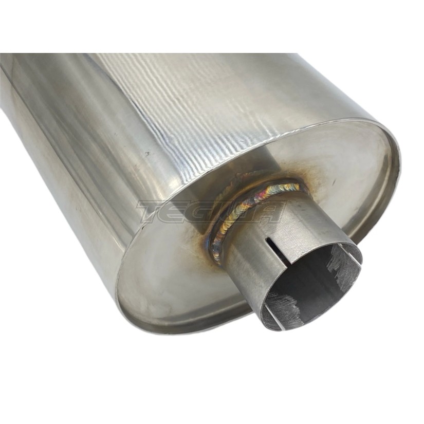 304 Stainless Steel, Tig welded, Oval Shaped and has an integrated Exhaust Tip. This is a straight through muffler design has perforated internals for unrestricted flow and maximum horsepower. It produce a deep exhaust tone. The most famous characteristic about this muffler designed is the incredibly low drone that is produced. At low RPM light throttle you have a nice quiet sound and at WOT the muffler comes alive and gives you the thrilling sound of the engine note.