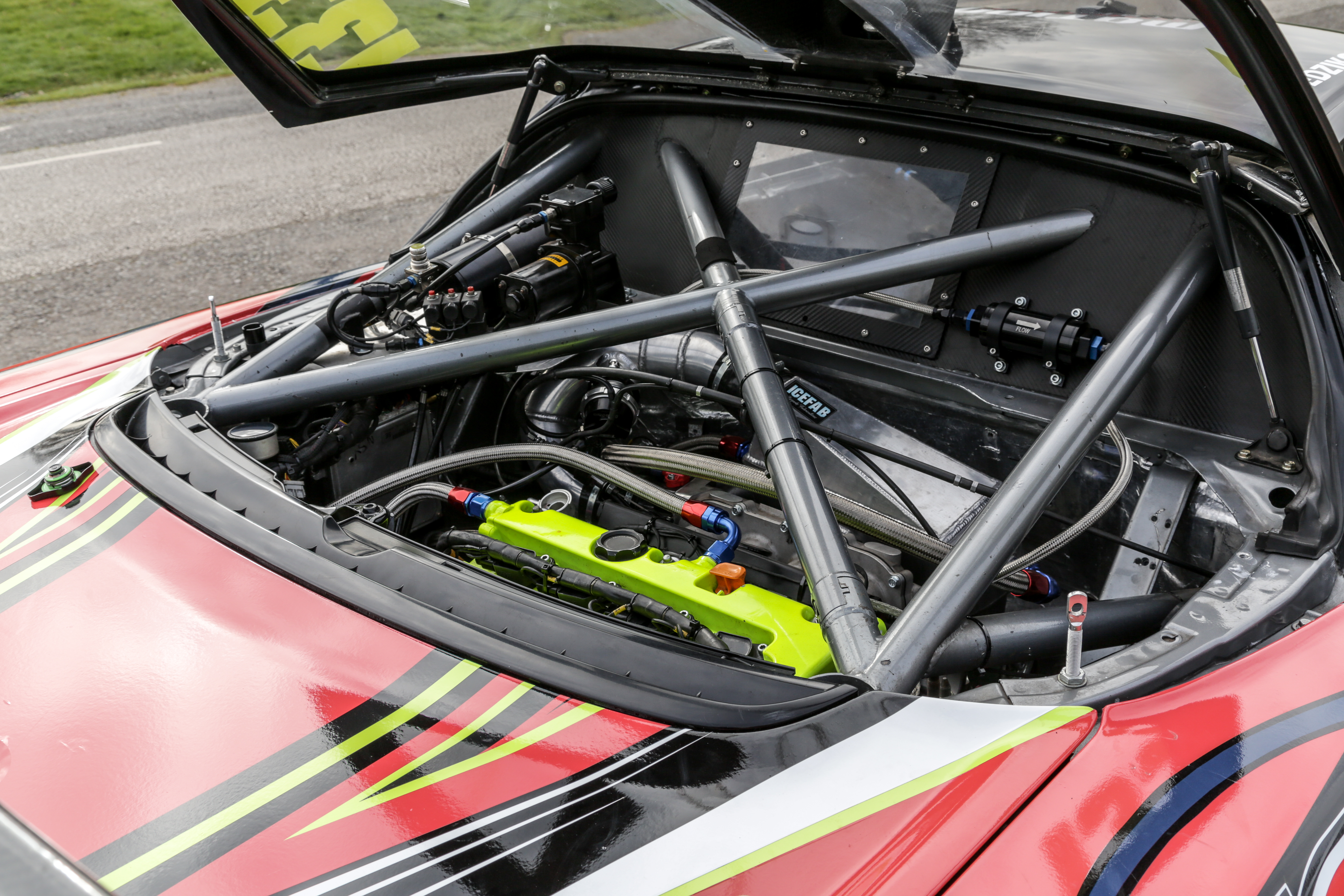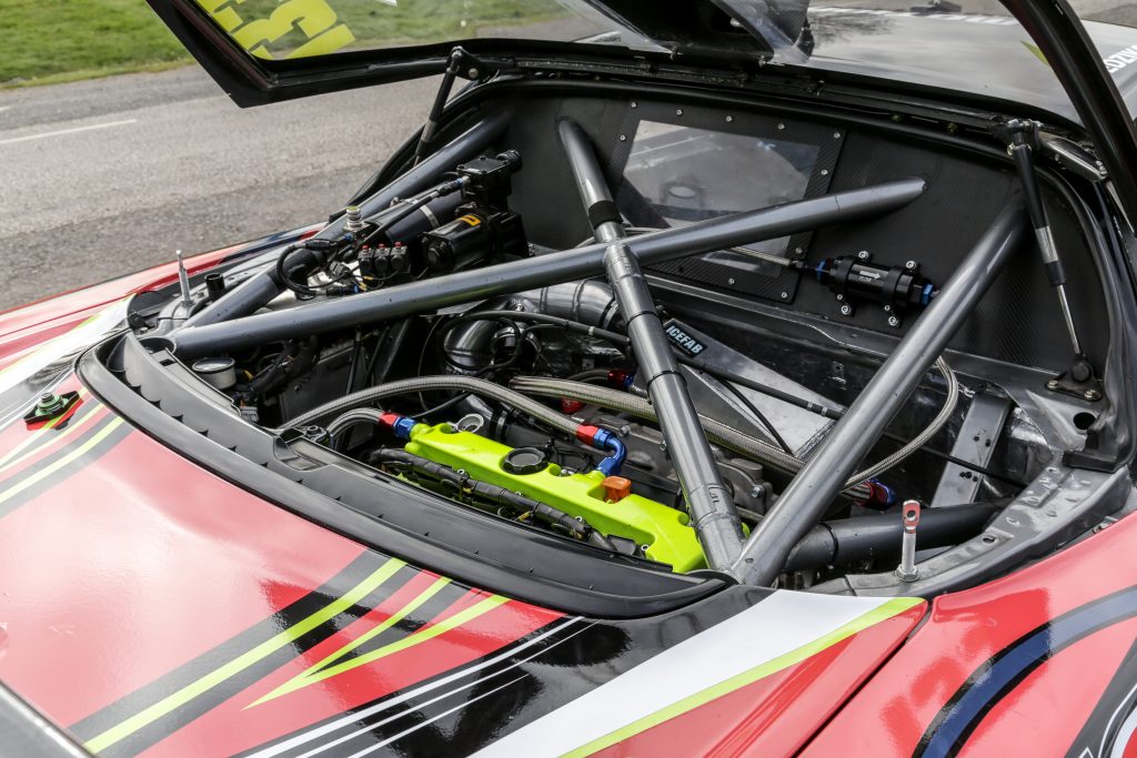 There’s plenty of custom bodywork on offer too. A Le Mans style aero front bumper make for a wider front end and wide front wings accommodate the hefty Pirelli slicks. A custom Tegiwa front splitter finish the front end off nicely and offer even more in the name of aerodynamics. Keeping the radiator cool is a carbon NSX-R style bonnet with a huge scoop to allow as much air as possible around vital components.