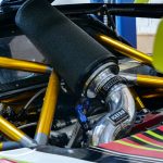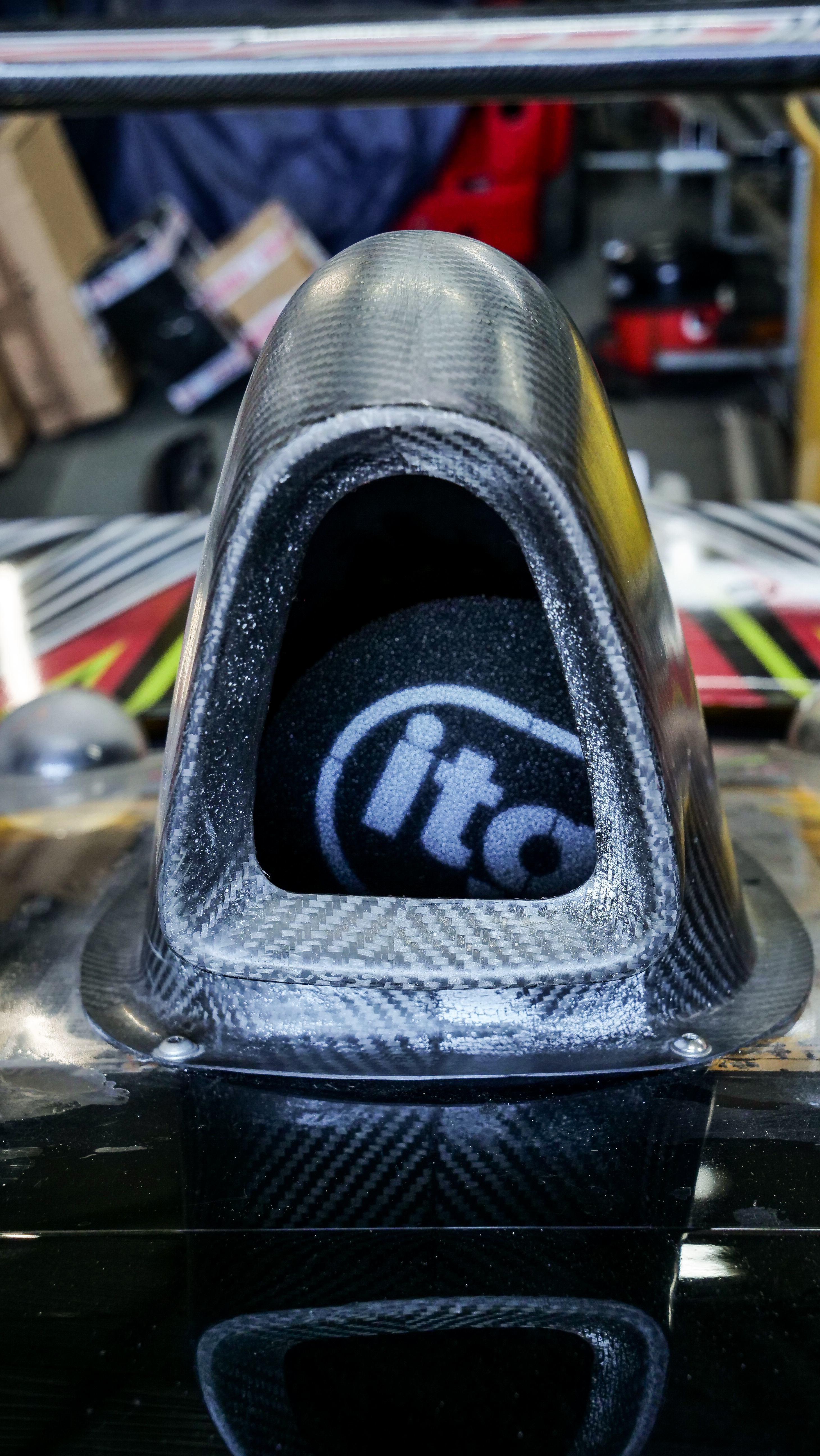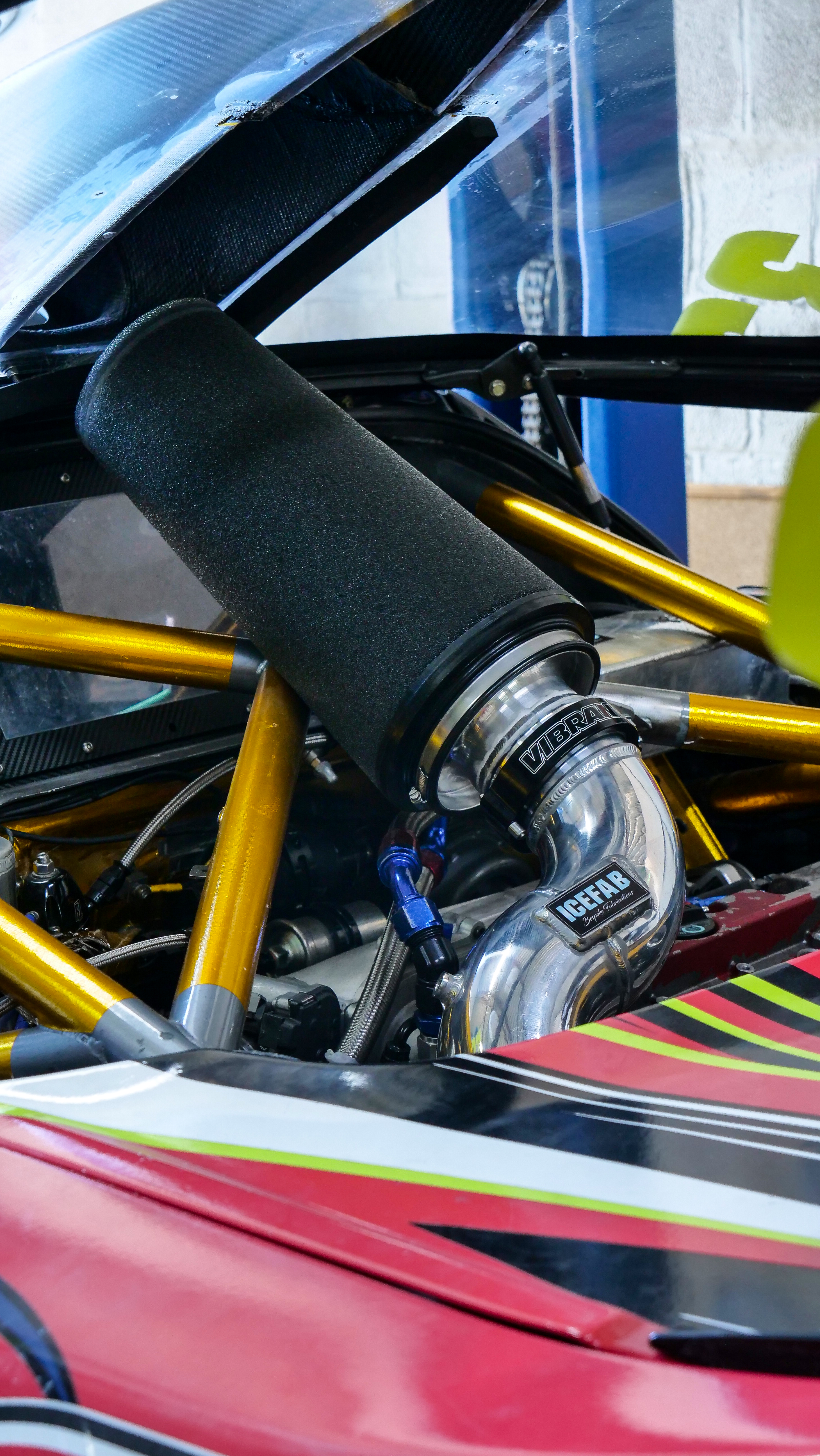 To help keep things cool, we use a T7Design electric water plate kit that allows us to run 2 Davies Craig water pumps. This helps us to save weight, reduce parasitic drag and allows us to tuck the alternator closer to the block too. The massive ITG air filter, which are normally used on 1,200 horsepower racing trucks, makes sure that we have high volumes of air running into the intake via the Super GT style roof scoop.