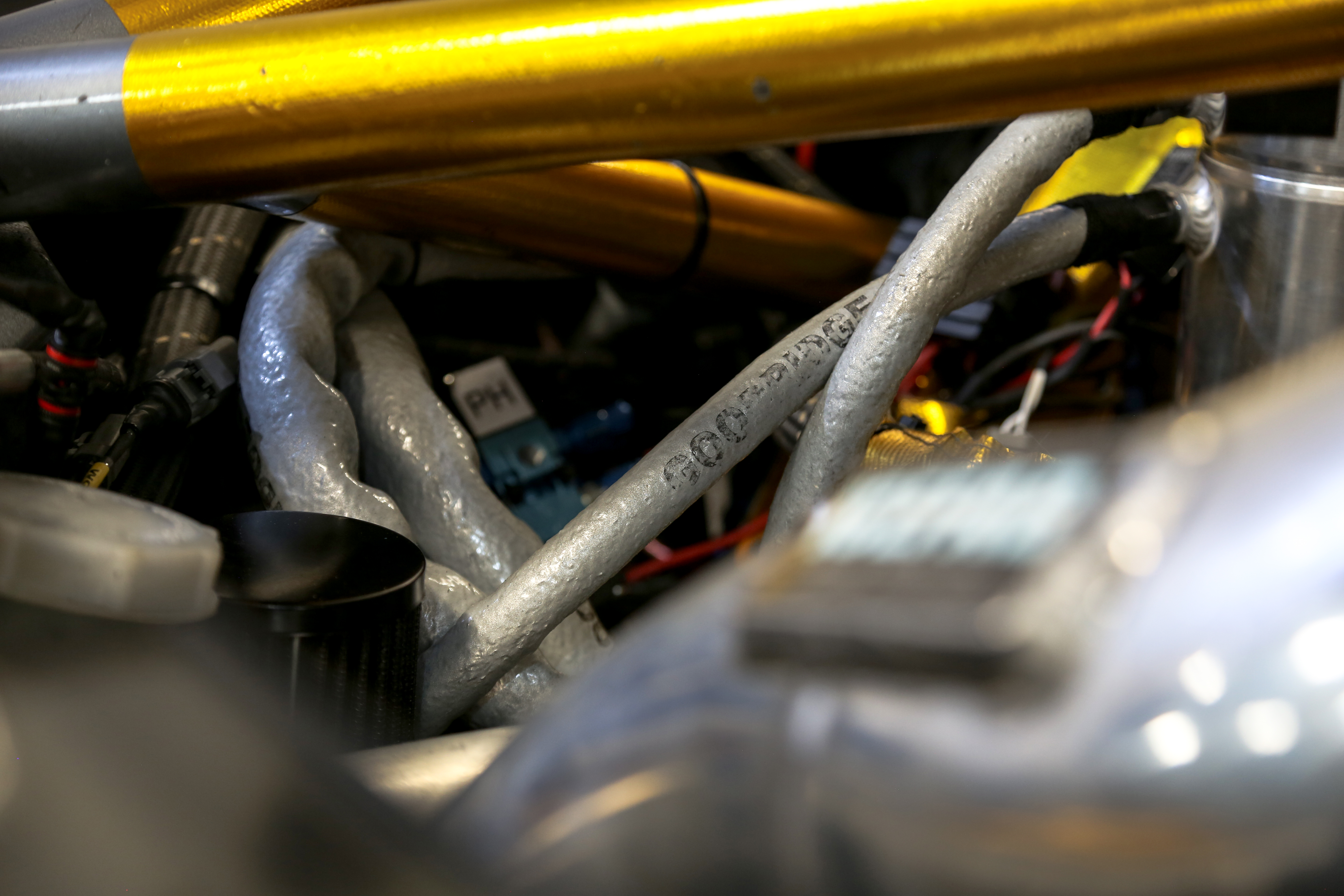 Since they’ve plumbed the lines in, Goodridge have covered them in Firesleeve which is engineered for exposure to varying degrees of heat. The texturized braided fibreglass insulating inner core maintains and stabilise internal temperatures whilst minimising surface temperature.