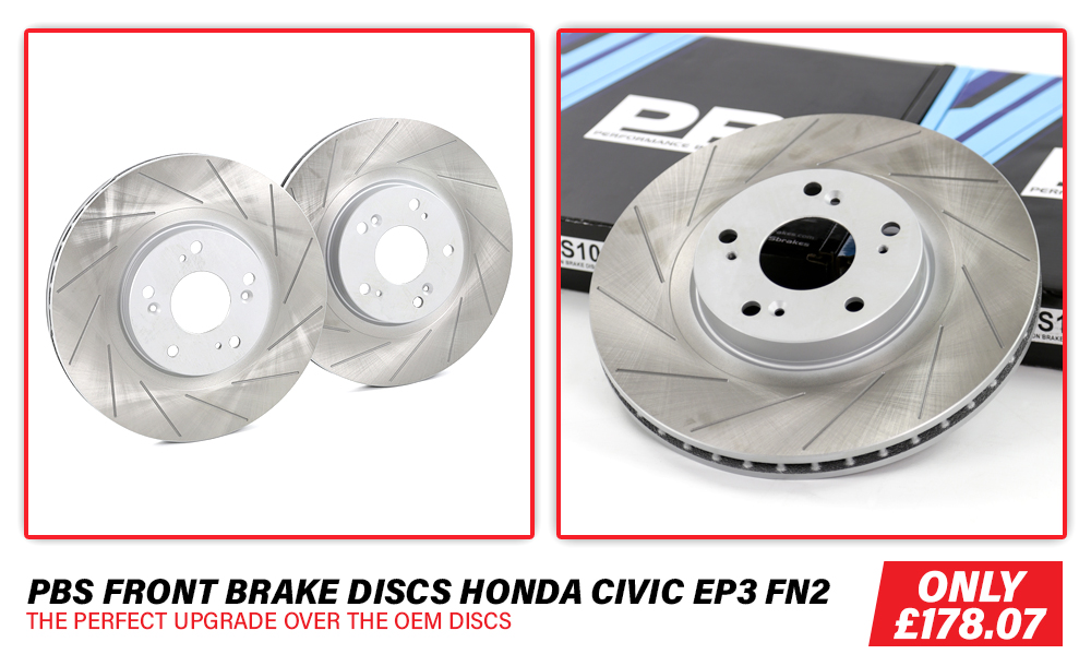 If you’re looking to upgrade your Civic EP3 or FN2 brakes from the OEM components, then these brand-new discs from PBS are a great place to start. Featuring high carbon content that provides superior strength over heavy-duty cycles on track, these discs are the perfect match when using PBS brake pads!