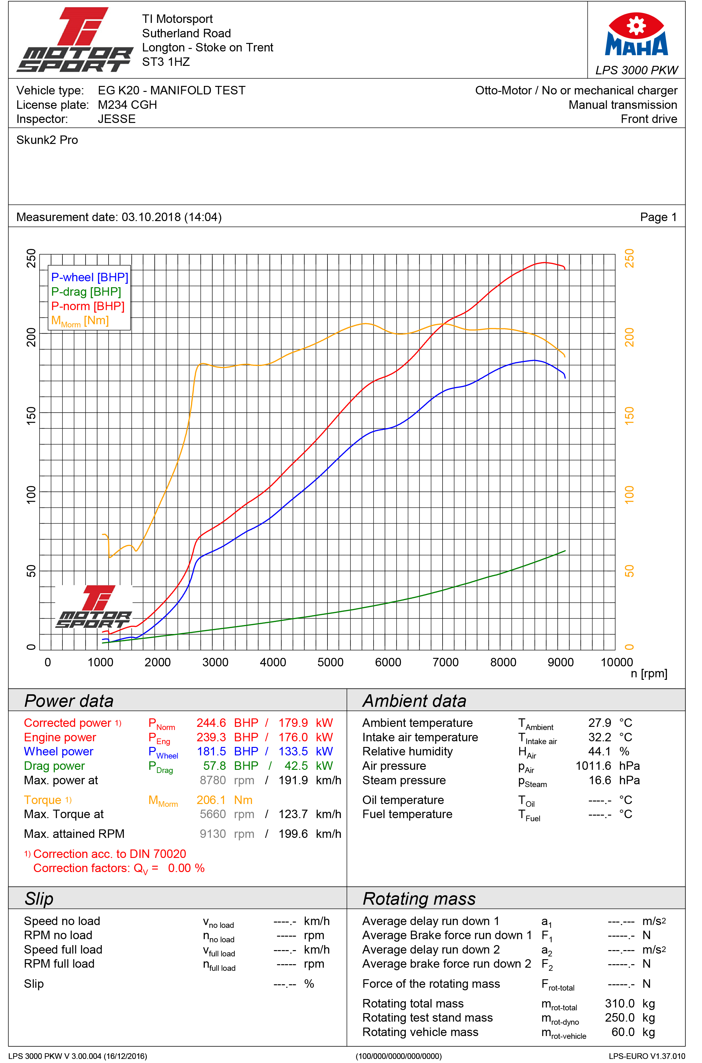 The older generation intake from Skunk2 but good results where expected none the less. We tested this as is, straight out the box, fitting was probably one of the easiest of all 5 manifolds and it looks well in the engine bay but if i’m brutally honest i dont rate it much. Peak power was barely improved upon at 244hp, we also had developed a good 10nm dip in torque around 6000rpm.