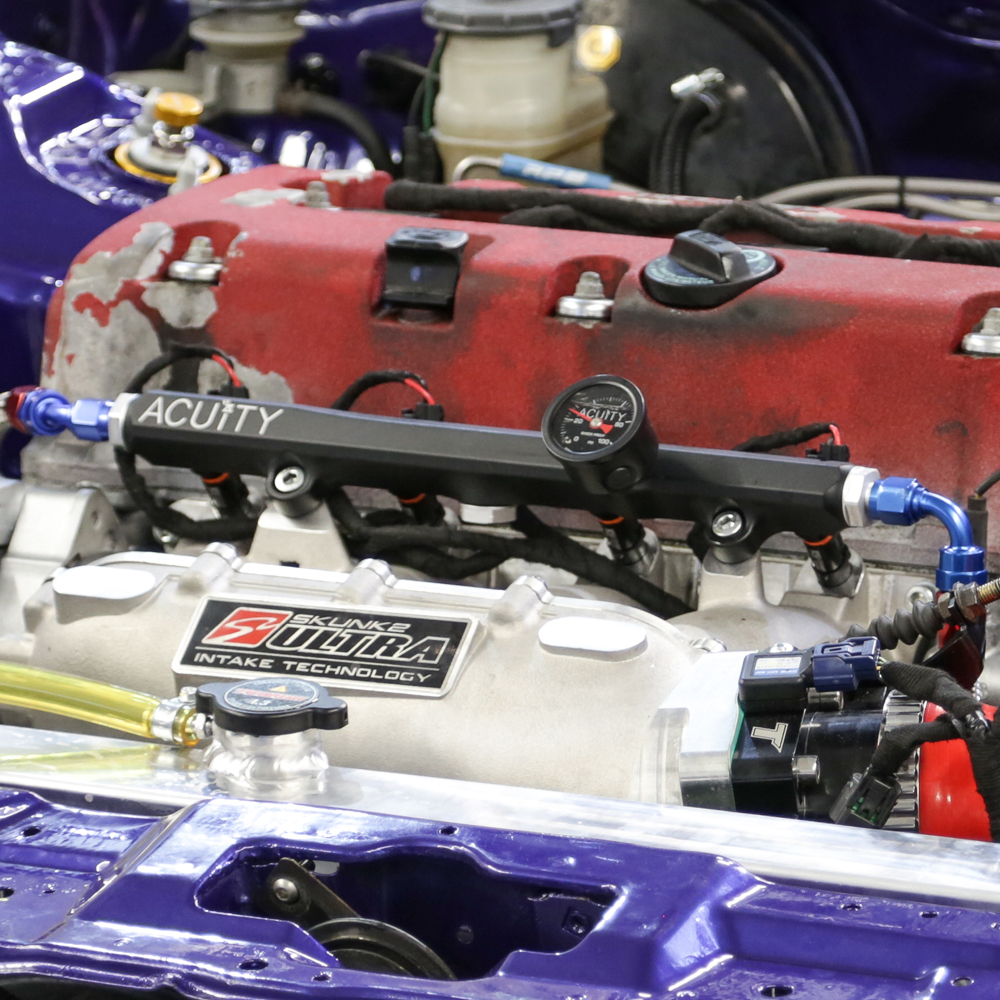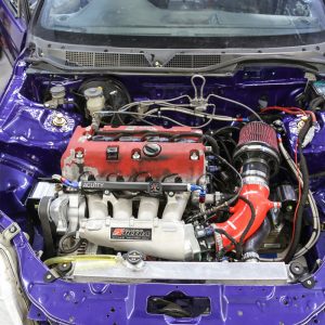 With that being said, onto our test car. We have a basic K20A2 slapped into an EK Honda Civic, quite literally, due to Mike finishing the engine swap at 1am the night before the tests! Basic bolt-on parts include the Skunk2 Ultra Street Intake Manifold and Skunk2 Velocity stack intake that you may have seen in other test articles. The fairly new to the market Tegiwa K-swap exhaust manifold, which features a fairly large runner, 4-1 style exhaust manifold with a megaphone 3” exit and into a 3” Greddy cat-back. Finally, Grams 550cc injectors just to be sure that we don’t run out of fuel. So, as you can see it’s a pretty basic spec engine that a set of camshafts would be the next logical step for.