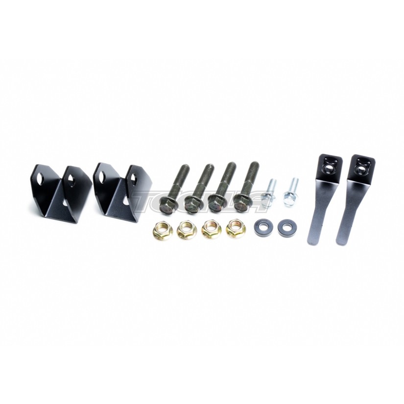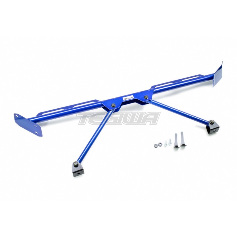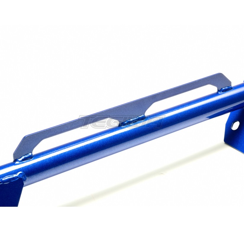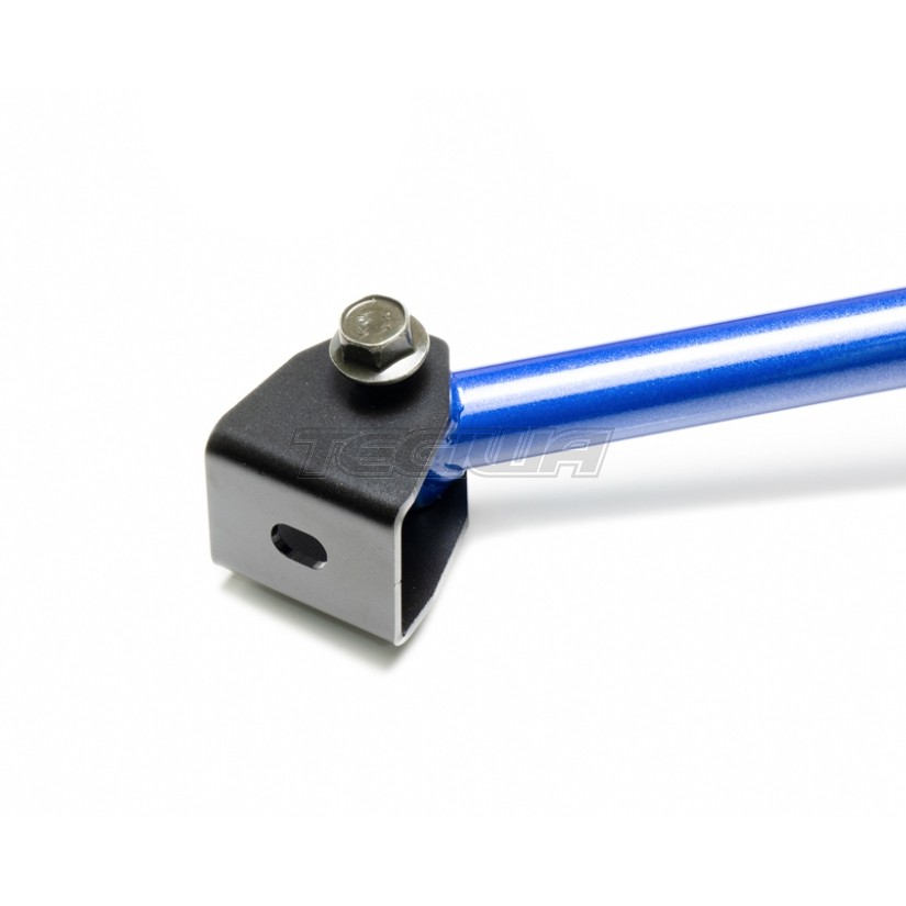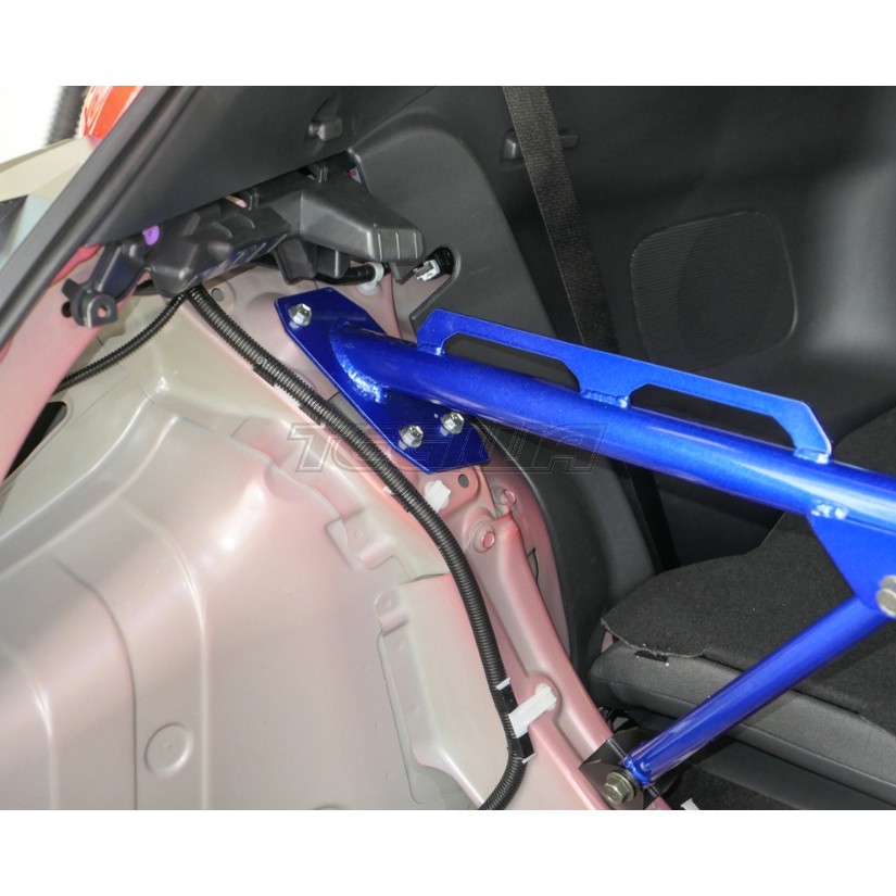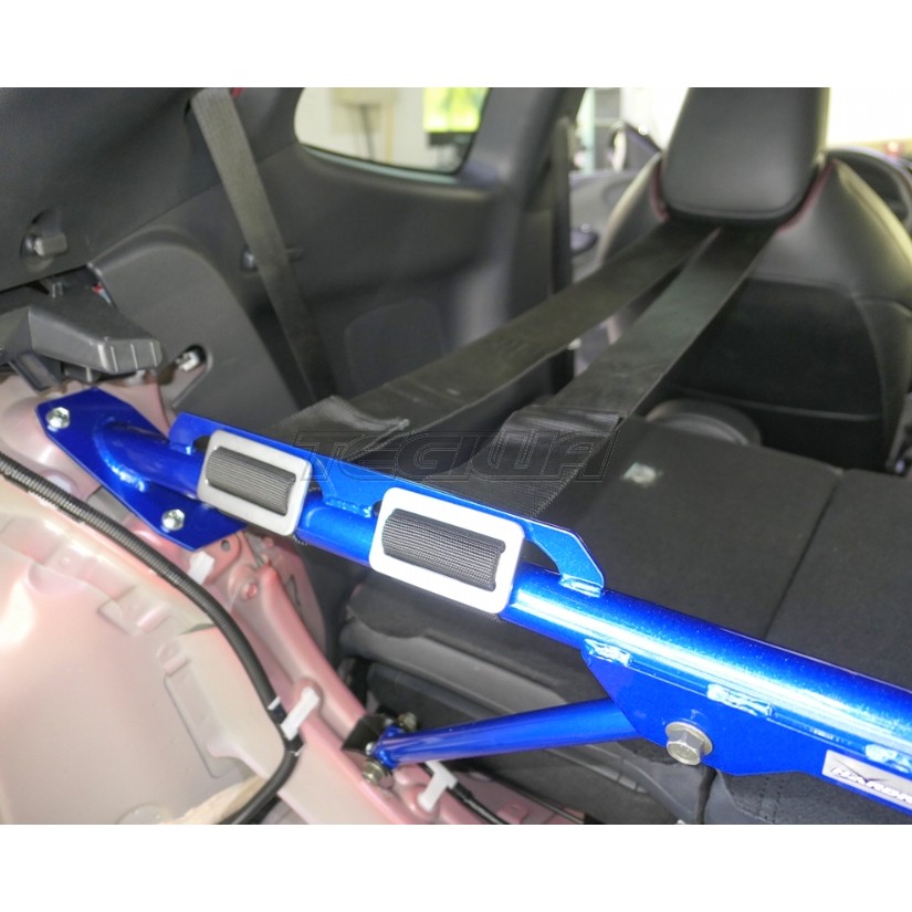 Introducing the rear strut harness brace for GR Yaris. The brace features high strength tubular steel construction, designed to help route and attach seat belt harnesses safely and securely without removing back seats. It also helps improve chassis rigidity by tying the car's B-pillar points together, offering greater stability and handling performance.