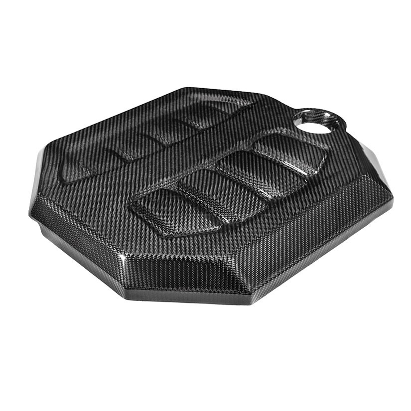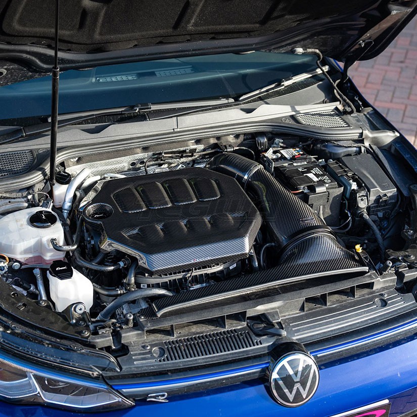 Crafted from prepreg carbon fiber, our MK8 Golf engine cover is a direct replacement using the OEM mounts. The photos also show our intake system available separately.