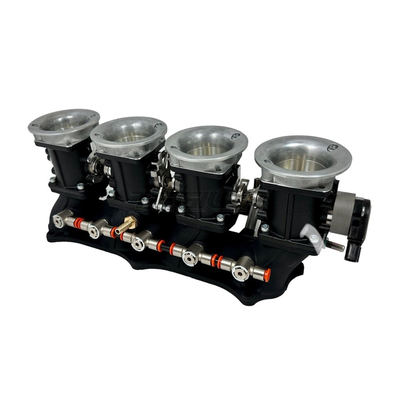 The kit includes 4 X 48mm parallel individual SF throttle bodies, curved manifold to avoid changes to the pulley, Jenvey cable linkage kit, short 20mm billet air horns, standard TPS adaptor along with an ITG air filter and backplate.