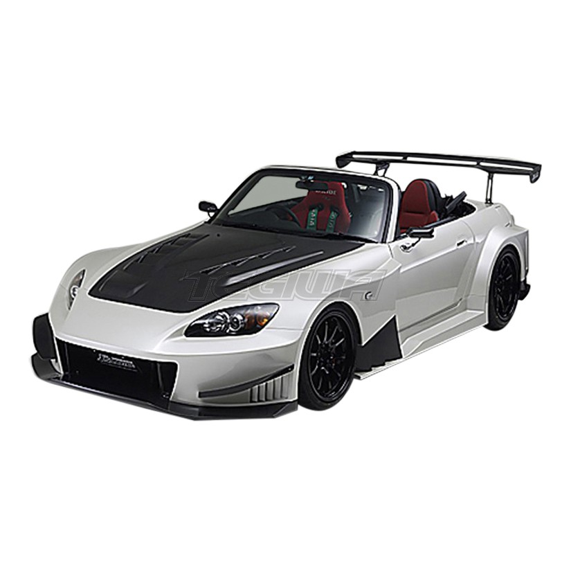 The wide-body carbon aero kit was produced with aerodynamic data including hands-on track statistics.With the wide-body design and undercarriage panels, an ordinary S2000 will be transformed into the ultimate track car.This aero kit minimizes the drag while creating whole body downforce; thus achieving unprecedented stability on the race circuit.