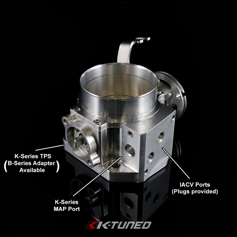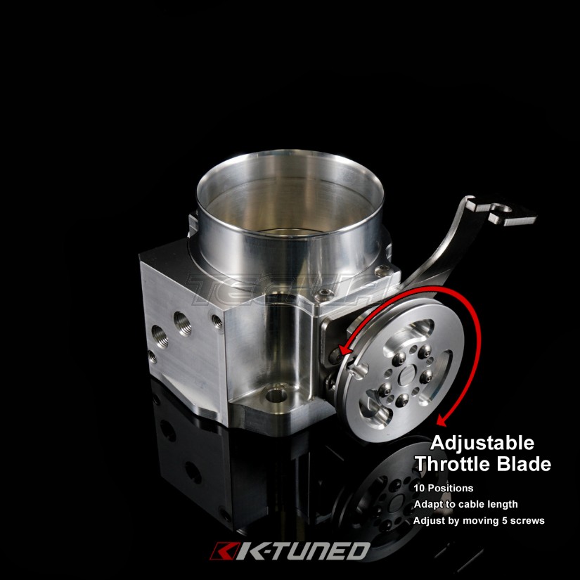 The OEM K-Series MAP sensor and IACV are both a direct bolt on, with the ports located on the bottom of the TB, where they are out of view for a cleaner look. Like our other throttle body you are able to change the adapter easily to change the TPS sensor from K-TPS to B-TPS. Please note that the 5V signal range of both TPS sensors is identical so this option offers even more choice on the final intake setup. The throttle cable connection is made using a fully adjustable throttle rotor with 10 settings. All K-Tuned Throttle Bodies are constructed with 6061 billet aluminum with a brass throttle blade and a stainless steel, center-less ground, throttle shaft that is leak tested to 90psi. They are also 100% North American made as are all the raw materials.