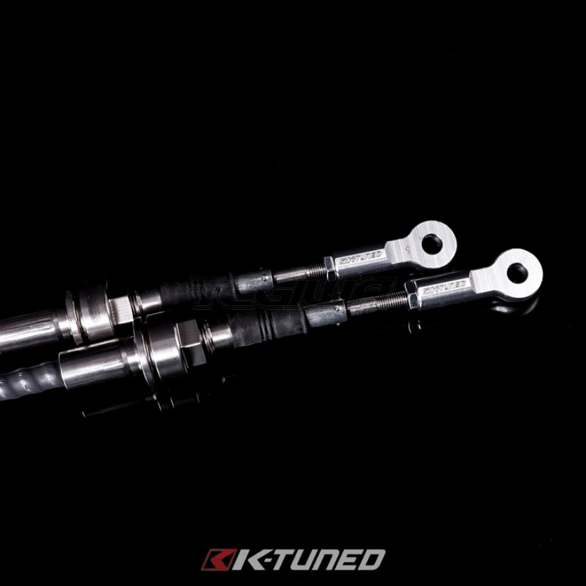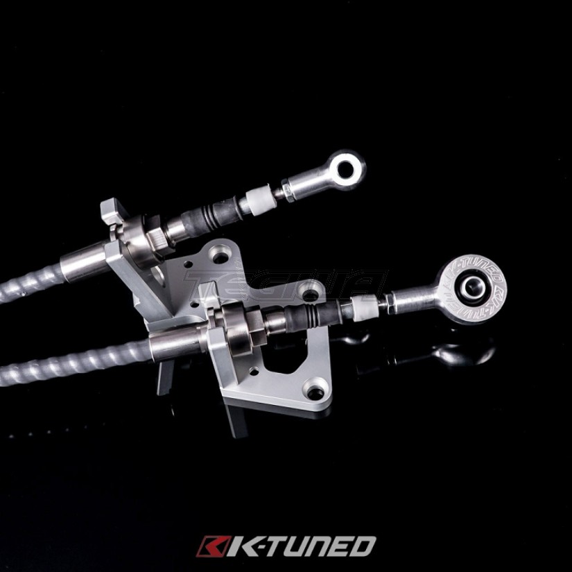 K-Tuned Race-Spec-Shifter Cables are made almost entirely of stainless steel, including the very important inner cable and all of the exposed cable guides. The outer cable is constructed with a low friction Teflon coated inner liner and polyethylene outer covering. Even the cable mounting ends are made from stainless steel and were designed with a threaded section to eliminate the need for the oem cable clips. However, take note that the oem clips can still be used if desired. Last are the rod end connections, these are fully adjustable and made from 6061 billet aluminum at all four ends. We made one minor adjustment at the gear selector, here we are still using a billet rod end, but we added a spherical Delrin insert to allow proper movement at this joint. Allowing this movement helps reduce possible cable bind during shifting. There is even a bonus, because we have also included our Billet Cable Bracket to make this a complete package. We are so confident in our shifter cable design that we even offer a 1 year warranty. If you are looking for the best K-series shifter cables available, your search is now over.