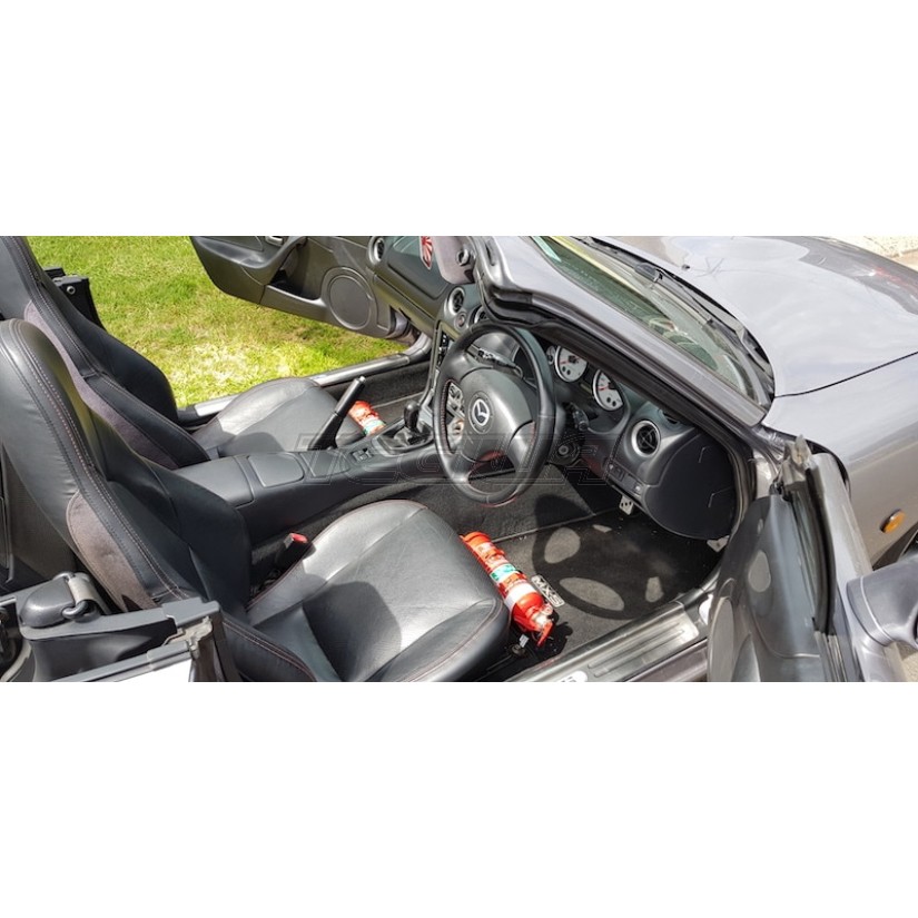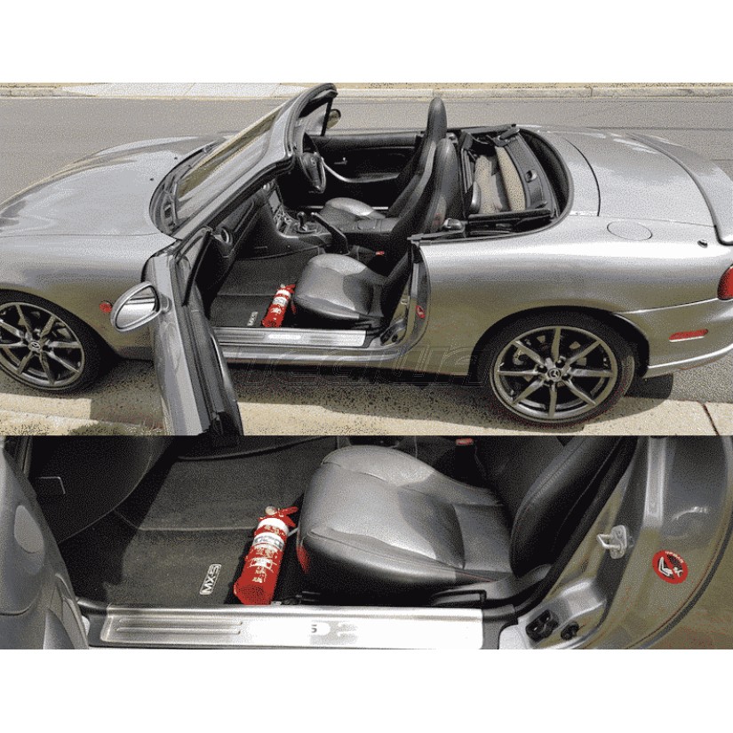This Fire Extinguisher Bracket fits the Mazda MX5 Miata NB. There are 2 brackets to choose from. 1 for the Left Hand Side and 1 for the Right Hand Side.