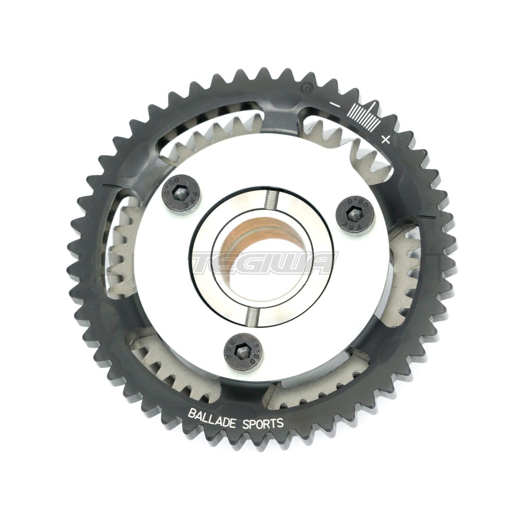 Ballade Sport 00-09 S2000 Adjustable Drive Gear allows the user to advance or retard the cam timing simultaneously up to 3 degrees. Engines with old timing chains can benefit with the use of this adjustable drive gear to re-calibrate all the timing indicators to their F20c & F22c engines ie: Intake, Exhaust, & Crank Pulley. It is especially crucial to re-calibrate cam and crank timing for resurfaced cylinder heads or decked engine blocks, which leave you with longer timing chains. The drive gear comes fully assembled with the idler gear and sprocket. Made out of hardened steel matching the same HRC rating as the original Honda OEM equipment.