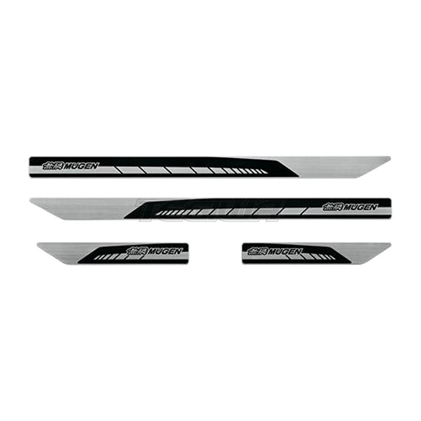 Brushed finish door sill scuff plate with MUGEN logo. Design giving a sporty impression to the interior of the car 4pcs each of the front and rear plates as a set Two colors, black and red are available.