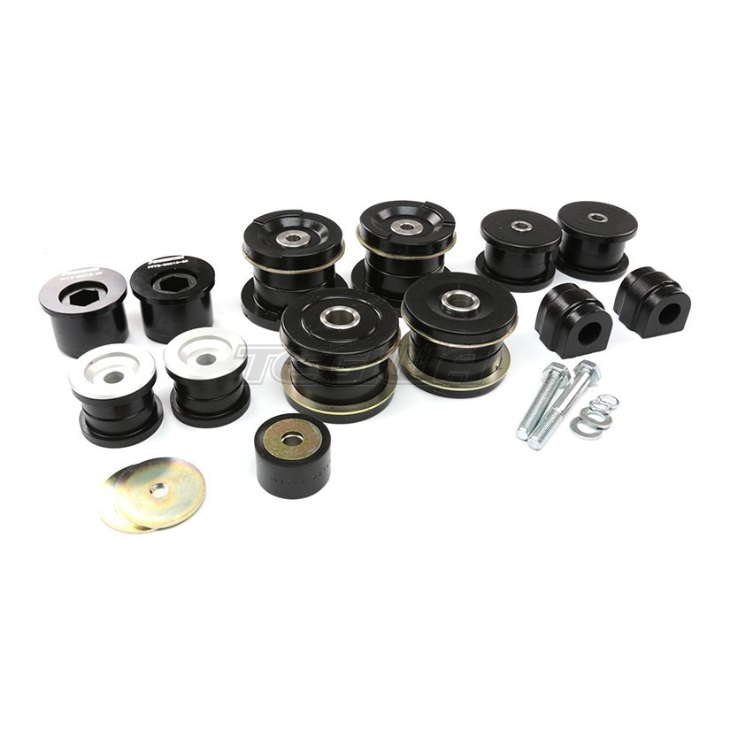 Kit includes: 2x Front Wishbone Rear Bush, Caster Offset P/N: PFF5-5601GM3BLK, 2x Rear Trailing Arm Bush P/N: PFR5-3608BLK, 2x Rear Roll Bar Mounting Bush 21.5mm P/N: PFR5-4609-21.5BLK, 2x Rear Subframe Front Bush P/N: PFR5-4610BLK, 2x Rear Subframe Rear Bush P/N: PFR5-4611BLK, 2x Rear Diff Rear Mount P/N: PFR5-4620BLK, 1x Rear Diff Front Mount P/N: PFR5-4621BLK.