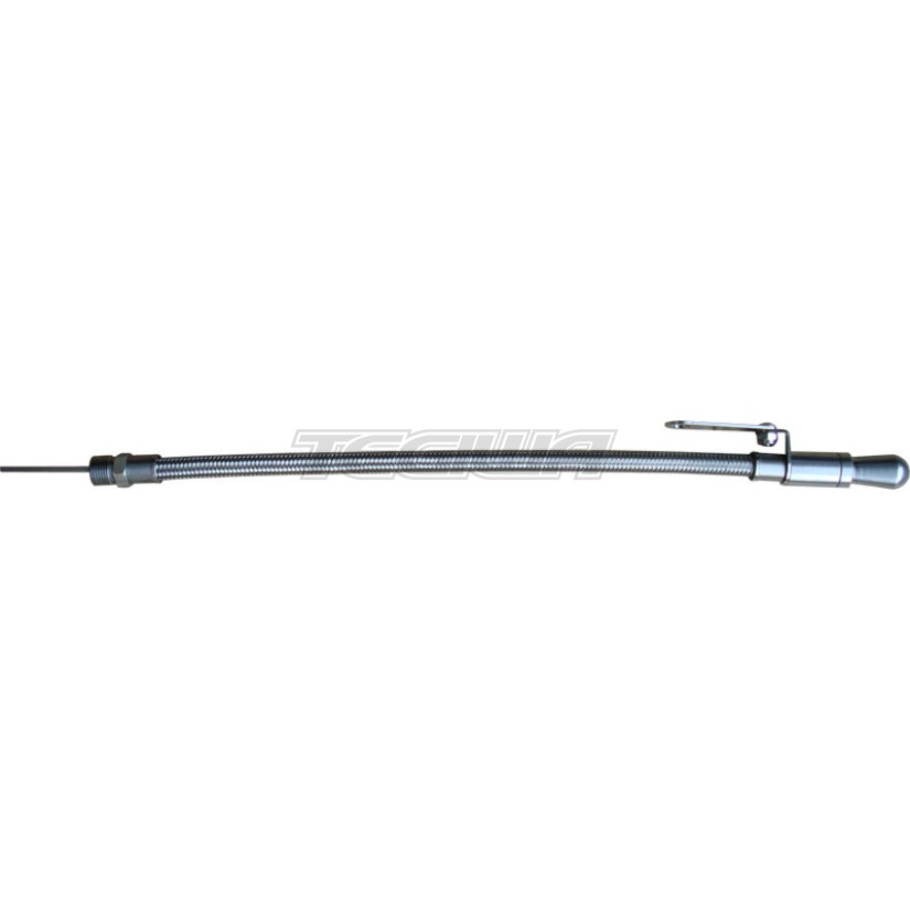 This flexible braided stainless steel dipstick is the perfect addition to your Ford oil pan. This part screws into the oil pan, so make sure you have the appropriate threaded inlet. The thread is 5/8"-18. Adjustable mounting tab ranges from 11.25" to 15.25" from where the dipstick screws into the oil pan. Fits: 289-302-351W-429-460.