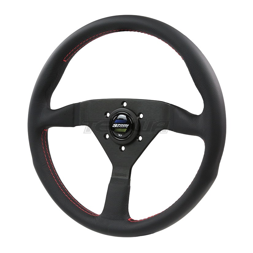 SPOON Steering Wheel. The Spoon Steering Wheel is made by the top notch steering wheel manufacturer MOMO. 340mm in diameter and featuring a strong extra thick grip, this steering wheel will give you maximum performance and feel. Fits all Momo compatible steering hubs (HKB, NRG, Spoon, Momo). Leather grip with red stitching. Spoon's latest BLUE/YELLOW horn button included.