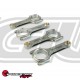The 2-piece forged 4340 chromoly construction provides outstanding strength and quality. Each rod is heat-treated, magnafluxed, CNC machined, and shot-peened to stress-relieve the metal. The rods have precision alignment dowels to positively locate the rod cap, maintain big end bore size, and eliminate cap walk. They feature bronze alloy pin bushings for floating wrist pins and come standard with 220,000 psi rated 3/8” ARP2000 rod bolts. Instructions and ARP Lube are included.
