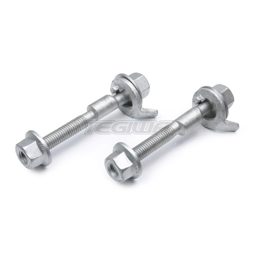TEGIWA Camber Bolts. When you change your vehicles ride height you can expect to change your vehicles suspension geometry at the same time. Camber is the most severe change which will affect tyre wear and the handling of you car. These kits allow you to tune your cars handling and reduce uneven tyre wear. They are designed for non-slotted struts. It allows both positive and negative camber changes by replacing the upper O.E. strut/spindle bolt. This easy to use adjuster provides built-in adjustment over the life of a vehicle just by rotating the head of the bolt. Each kit contains two cam bolt assemblies, enough for both sides of the vehicle.