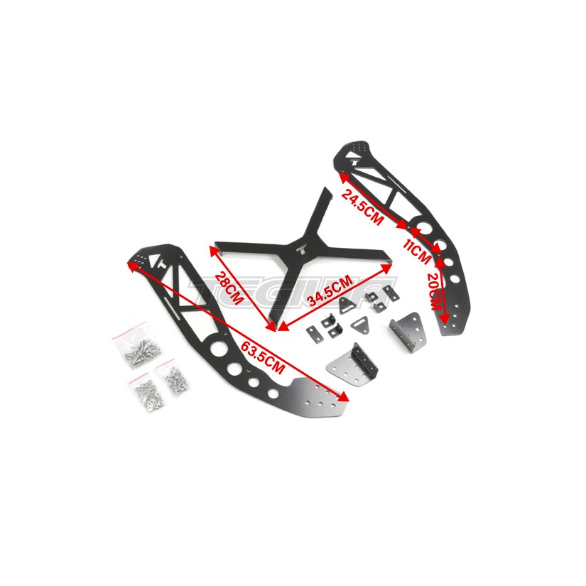 TEGIWA Civic EP3 Universal Rear Wing Mounts. The mounts are made from high quality strong and lightweight aluminium for motorsport and show use. Powder-coated black for a long lasting durable finish. Vertical mounts and x-brace both feature the Tegiwa ’T’ Logo. All fixings are A2 stainless steel. The mounting system weighs less than 2kg. These can be used to mount various universal style spoilers. Originally designed by Mark Burnett who still holds the Club NA record around Cadwell Park in UK Time Attack using these exact wing mounts.