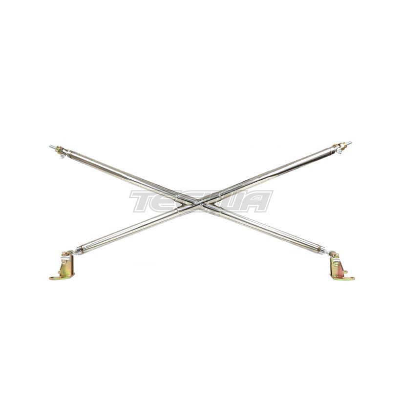 TEGIWA X-Brace. This cross bar connects the C-pillar to the rear upper strut towers making the rear of the car 'one' and reducing overall chassis flex. Constructed from TIG-welded 304 stainless steel and complete with zinc coated mounting hardware this brace transforms the rear interior both visual and functional aspect. Rear seats can still be used with this brace installed however padding is advised. This kit is specifically designed for the Civic EG hatch.