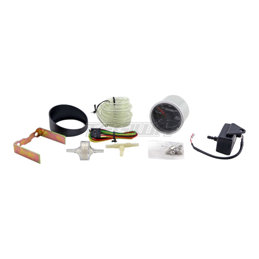 Electric 0-30PSI boost-only gauge for diesel vehicles. Includes bracket, anti-glare shield, boost sensor, wiring harness, T-piece, PVC hose and inline filter.