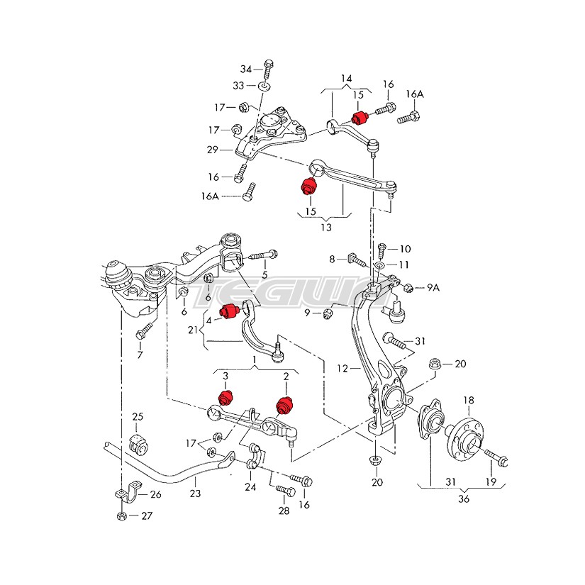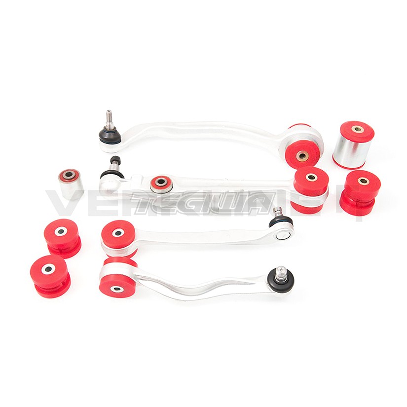 Full set of red polyurethane bushings for the front wishbones – 10 pieces set.