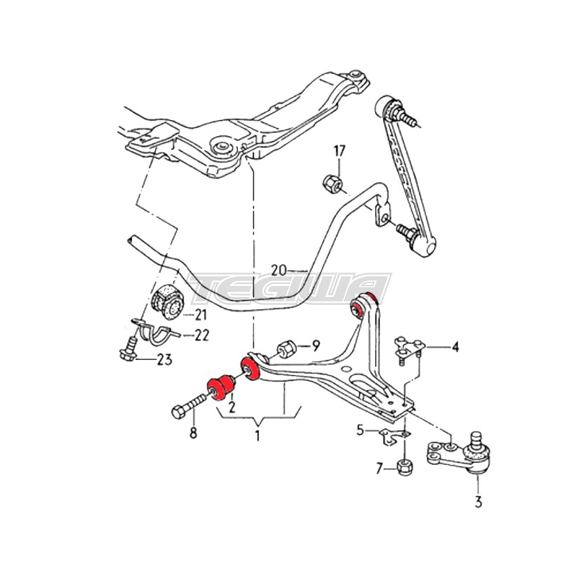 Polyurethane bushings work ideally in performance suspensions. Rubber suspension bushings are a proven compromise in performance vehicles. When additional horsepower is added, plus size tires then OEM or rubber bushings tend to stress beyond design limits. Polyurethane bushings are strong enough to control movement and maintain wheel alignment. This is a set for one axle. Recommended to use with our AudiSport replica wishbones. OEM part nr 8A0407181