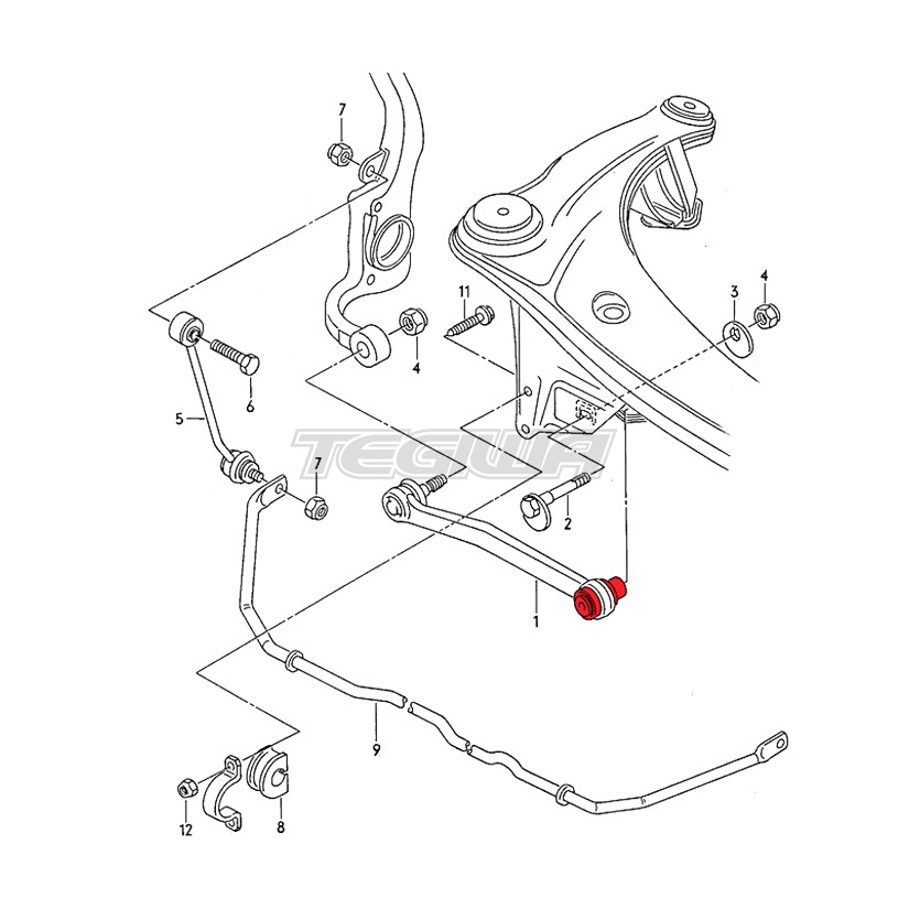 Polyurethane bushings work ideally in performance suspensions. Rubber suspension bushings are a proven compromise in performance vehicles. When additional horsepower is added, plus size tires then OEM or rubber bushings tend to stress beyond design limits. Polyurethane bushings are strong enough to control movement and maintain wheel alignment. Used in OEM part nr 8D0501530