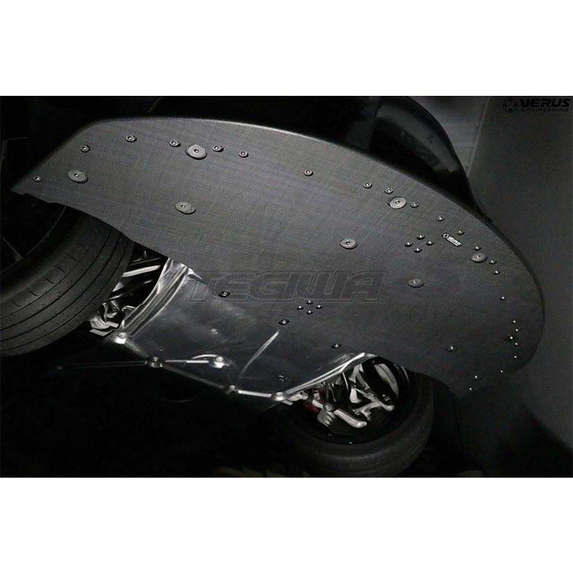 The splitter is produced from a carbon polyweave, which is the same material used in high forms of Motorsports. The material is not brittle, so no more issues with cracking like carbon fiber and ABS. It will not grab and bend under the car like aluminum units either. The material is also lightweight and stiff; which makes it a great splitter material.