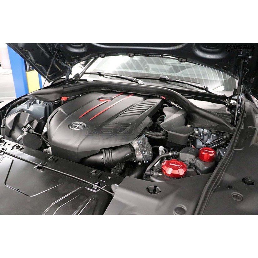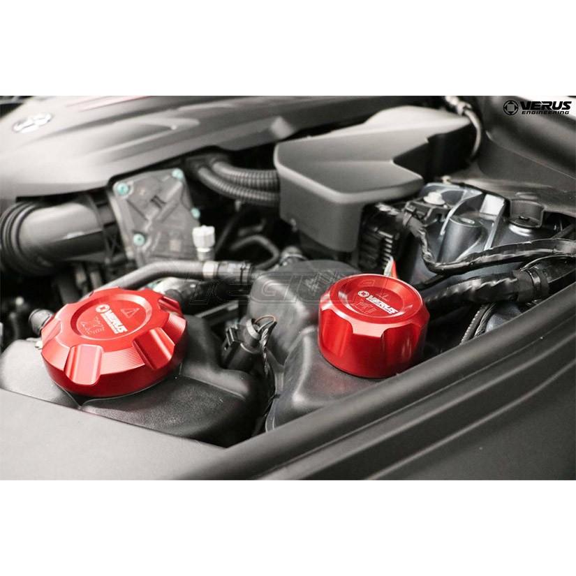 Cover up the lackluster plastic caps that come on your factory Toyota Supra with a cap machined in house from solid aluminum. The caps are offered in three common colors to add color to the engine bay. The units install easily within minutes with no tools required.