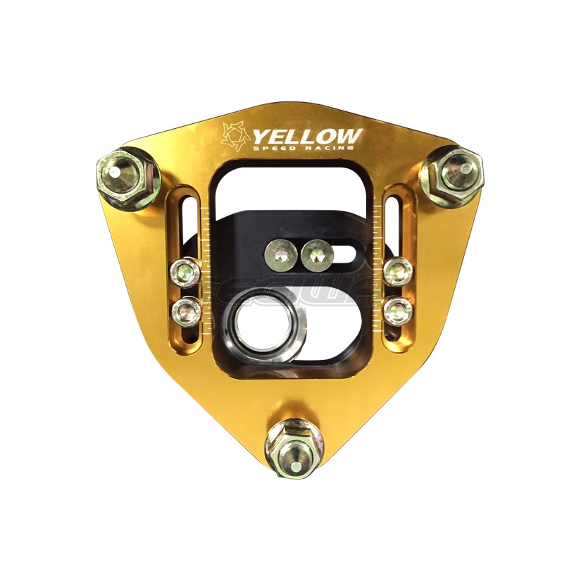 Yellow Speed Racing Camber and Caster top mounts. If you're looking to get a little more camber and/or caster out of your suspension then these are a great upgrade for the whole Yellow Speed range! Depending on your setup expect to see 3.5 to 4 degrees of adjustment out of these, a sizeable increase over the regular top mounts shipped with these kits.